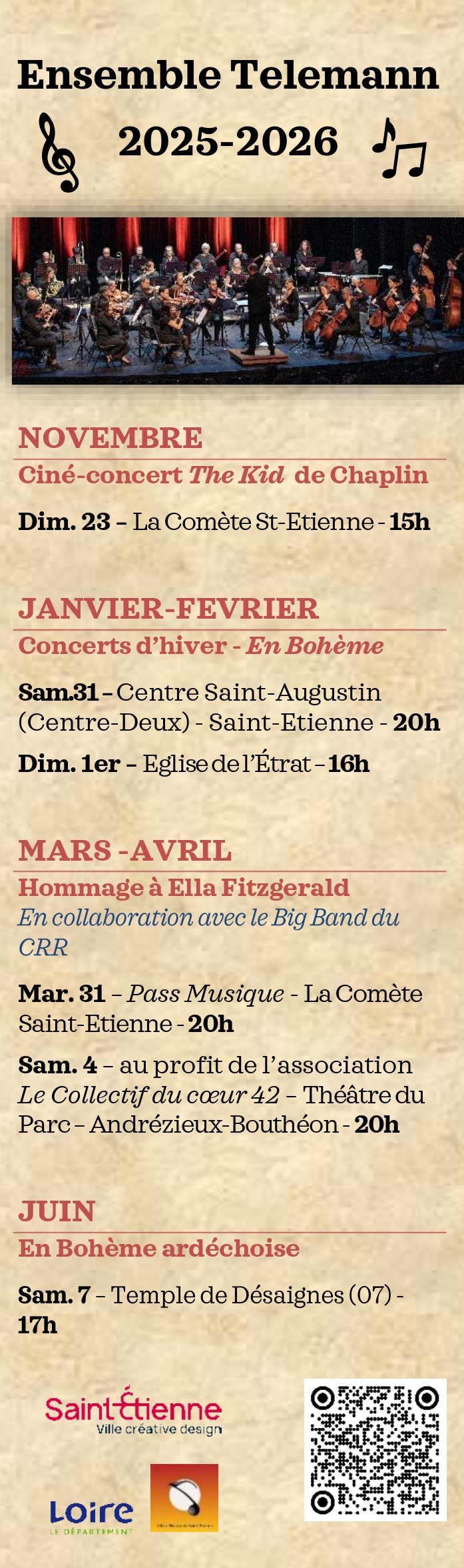 Afin de réduire les coûts (tant financiers qu’environnementaux) de ses différents concerts, l’Ensemble Telemann limite les impressions de programmes de salle et vous encourage à les télécharger ici
